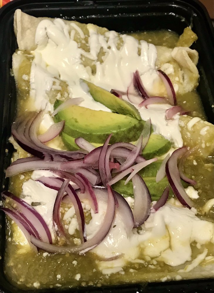 Corn chips covered in a green sauce, topped with sourcream, cheese, onions, and 2 eggs, fresh cilantro.