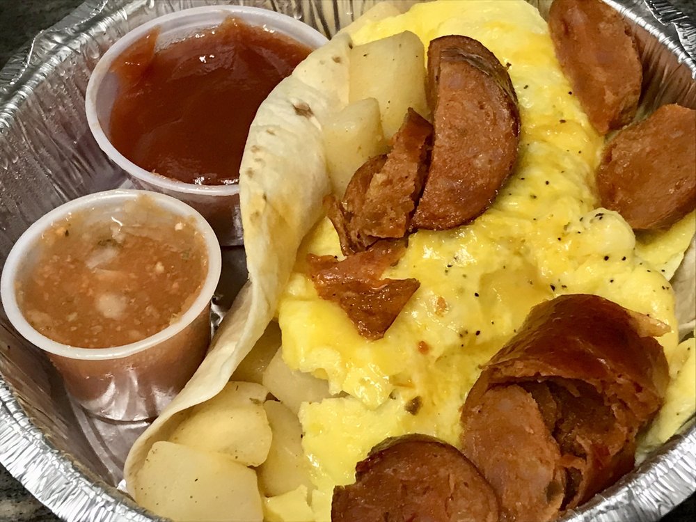 Flour tortilla, eggs, home fries, one protein